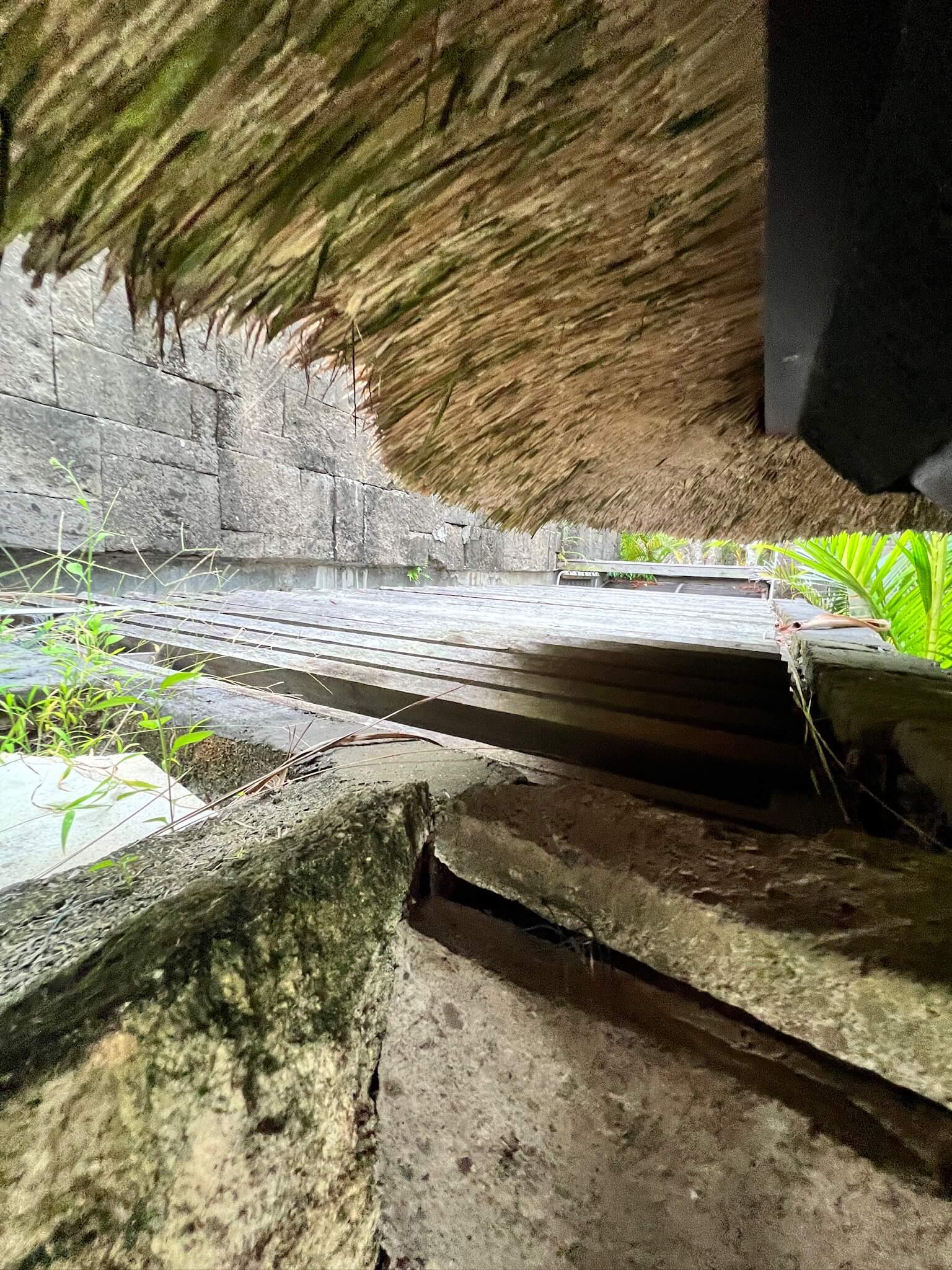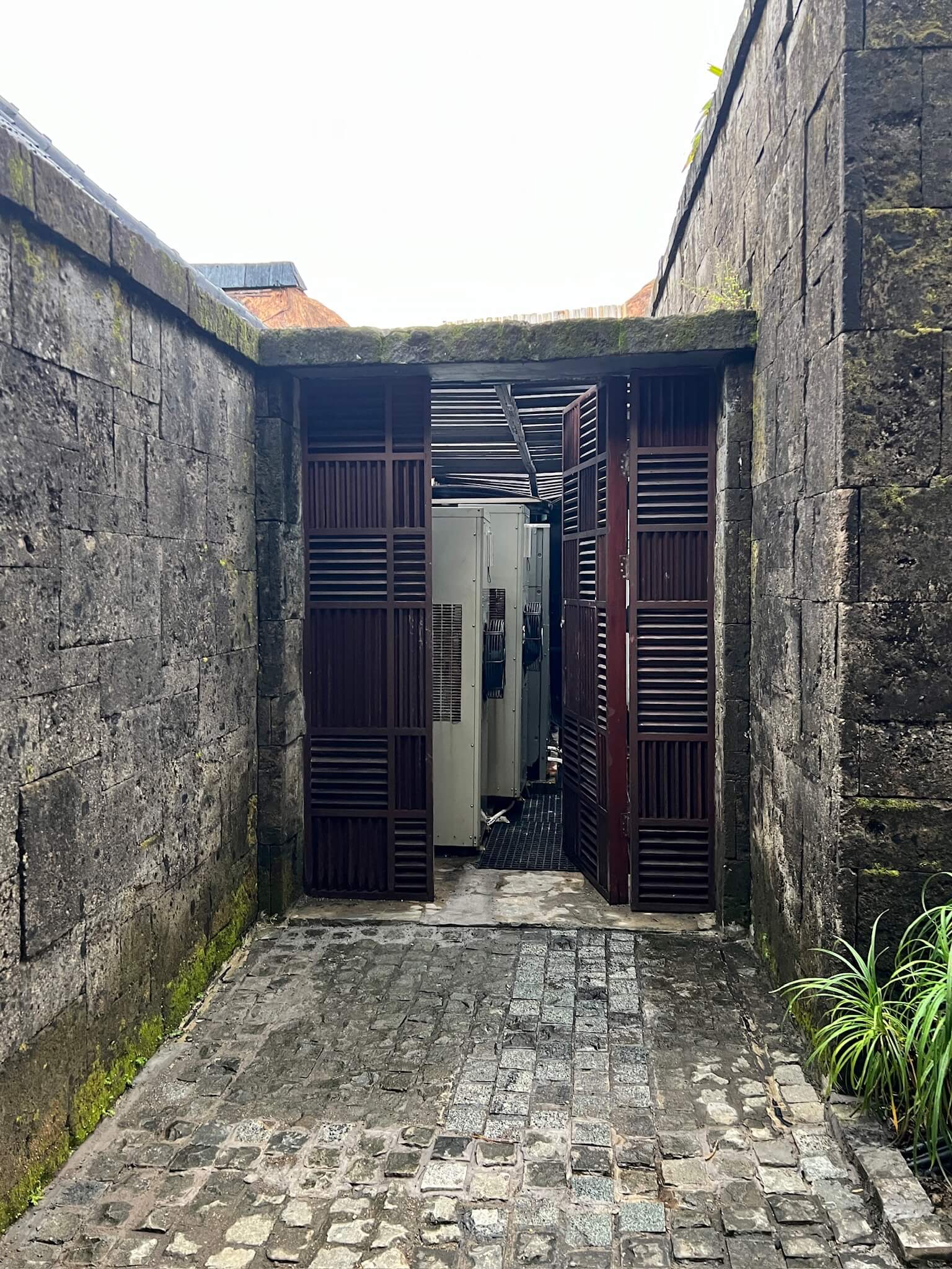 室内には空調が効いていますが、室外機はヴィラの門の反対側に置かれており、木板で蓋もされていました。