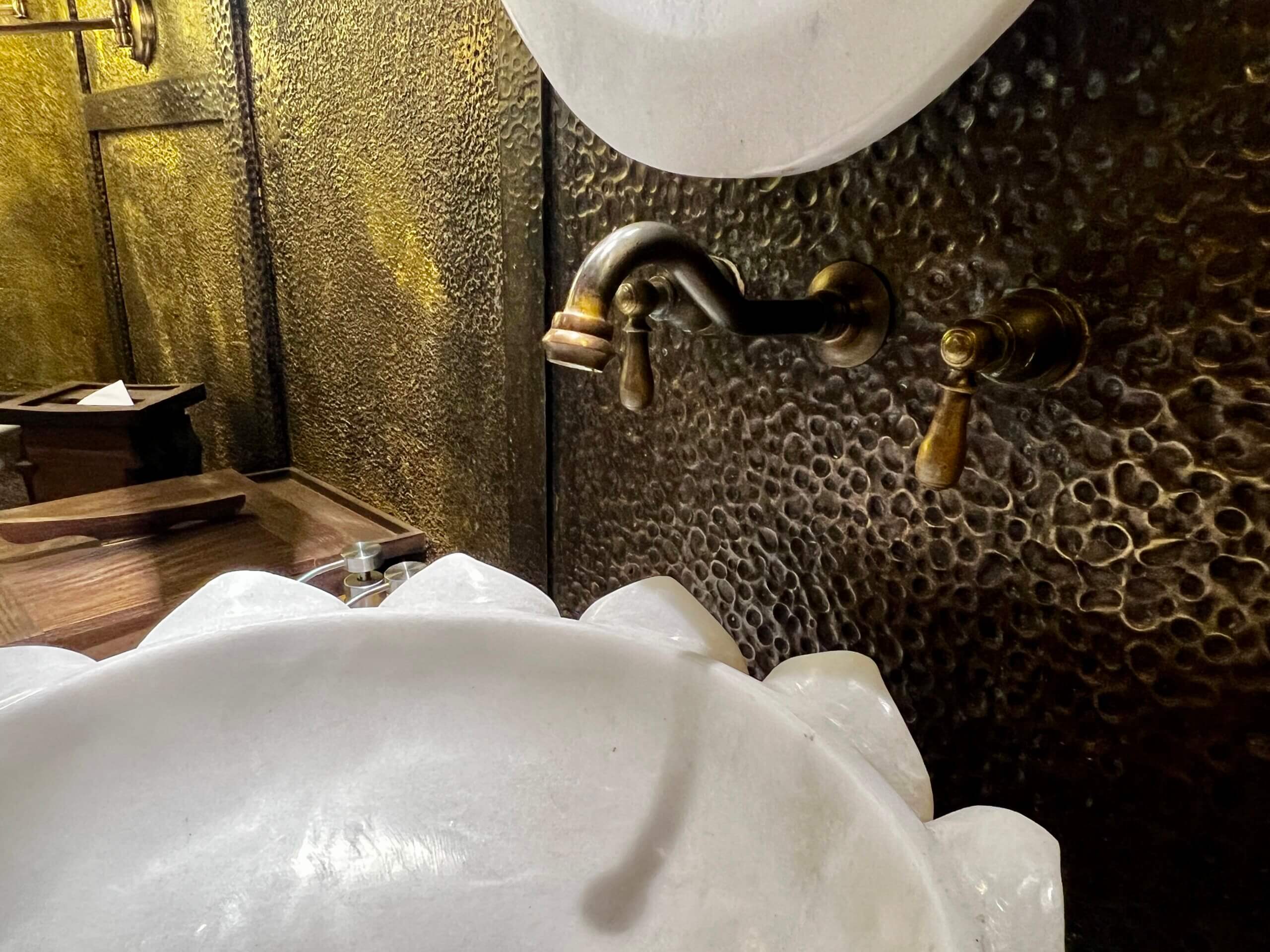そのほか、ベッドボードにはオレンジ色の黄麻布が使われていたり、水栓やドアノブが銅だったり、ドアを閉めるのがかんぬきだったり、一つ一つが自然素材でデザインされています。