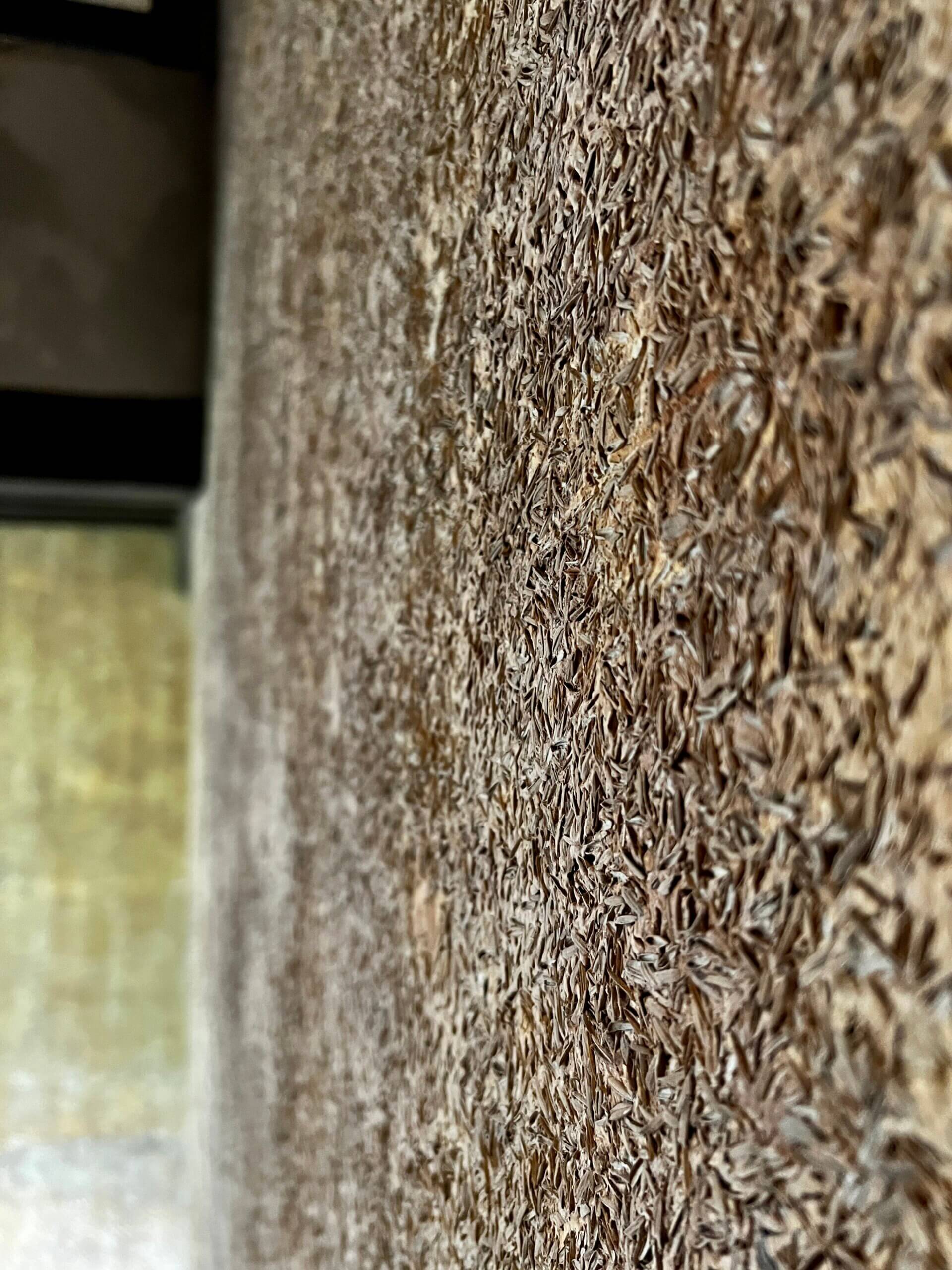 そして、壁にはよくあるクロスや塗装が一切使われていないのです。藁かと思いましたが、実はこれは米袋なのです