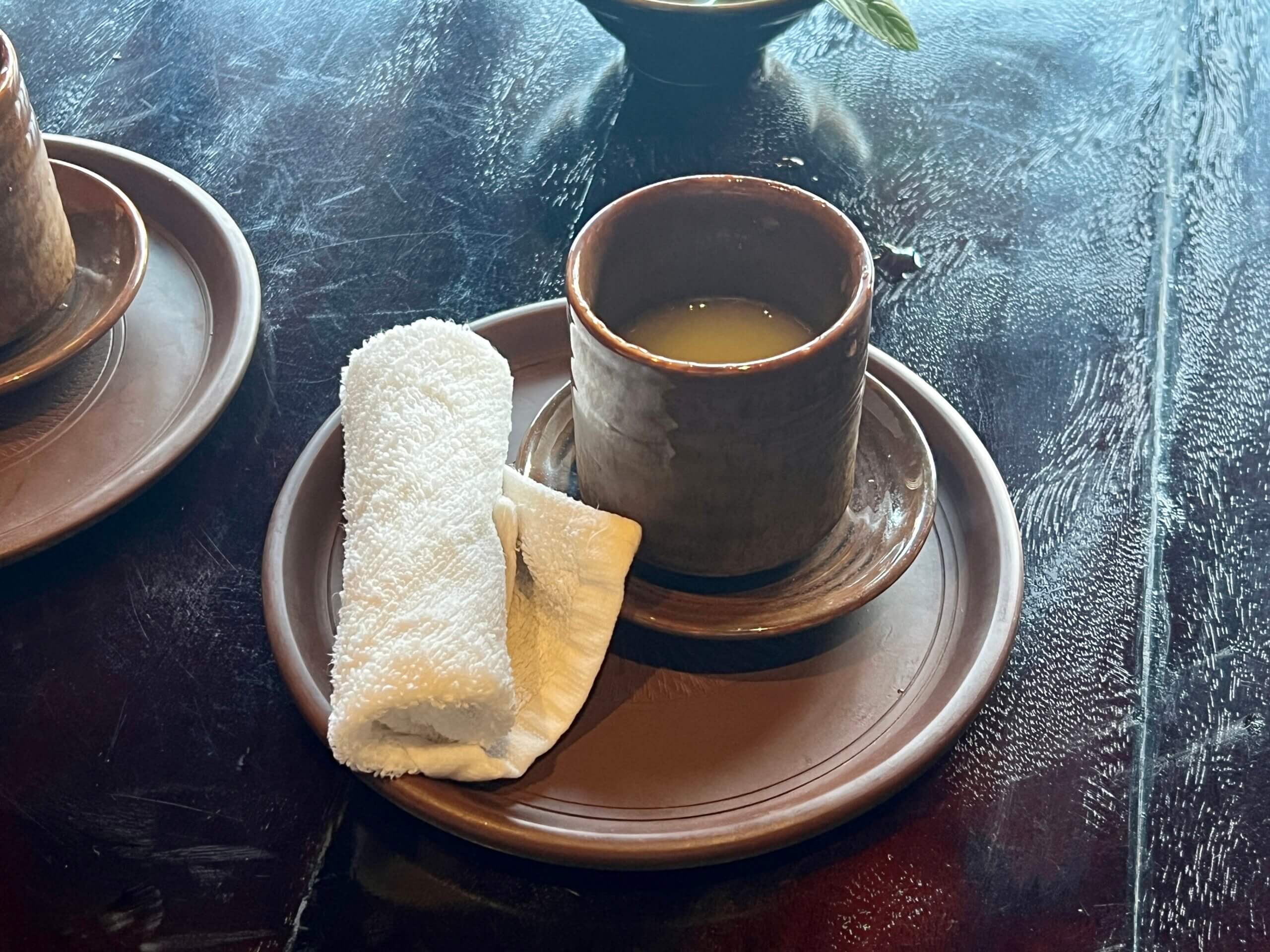 入口で靴を脱ぎソファ席に通されると、ウェルカムドリンクの冷たい生姜ジュースとおしぼりと一緒に、記入用紙を渡されました。体調や肌の質、アレルギーなど記入しました。