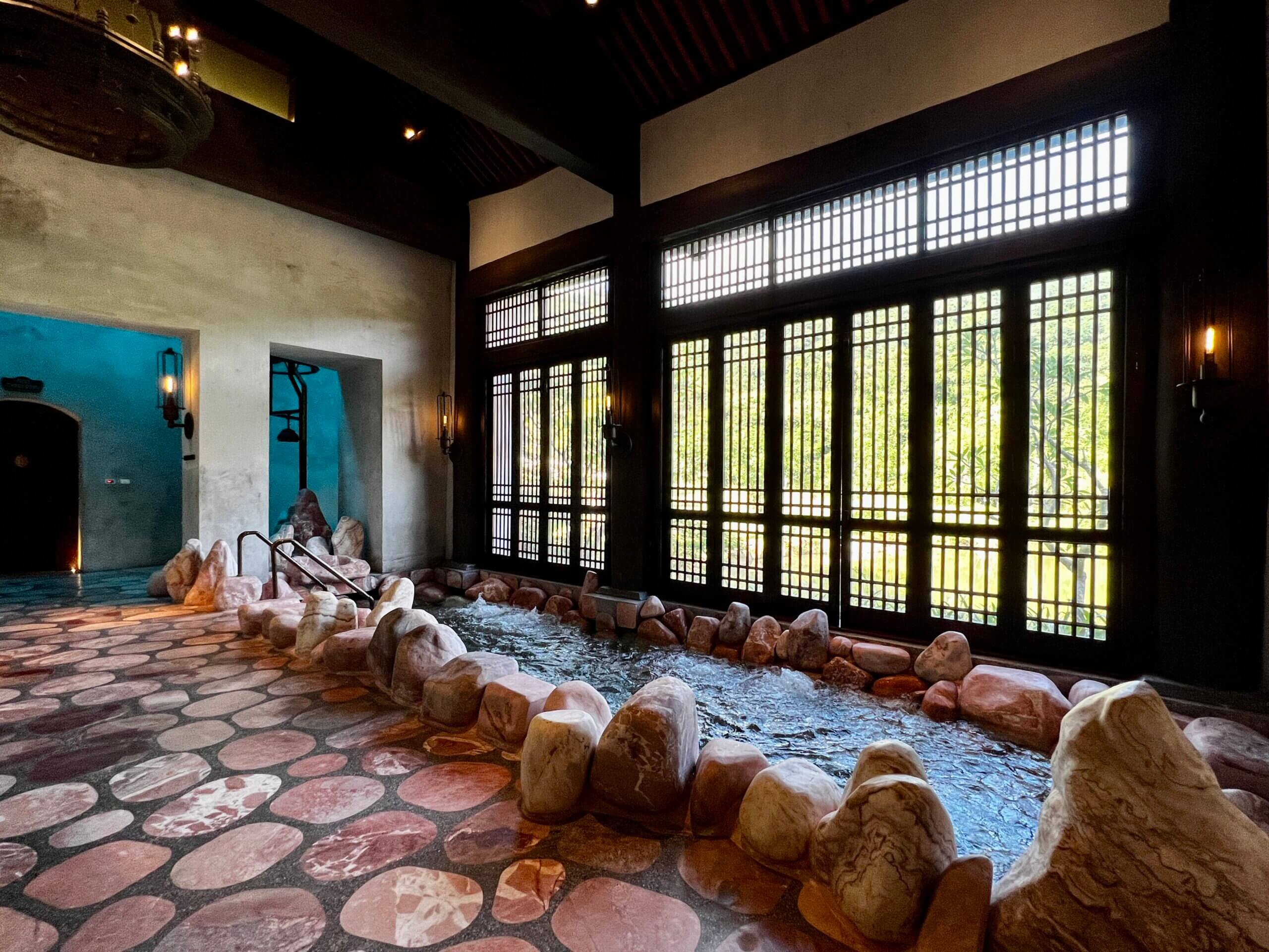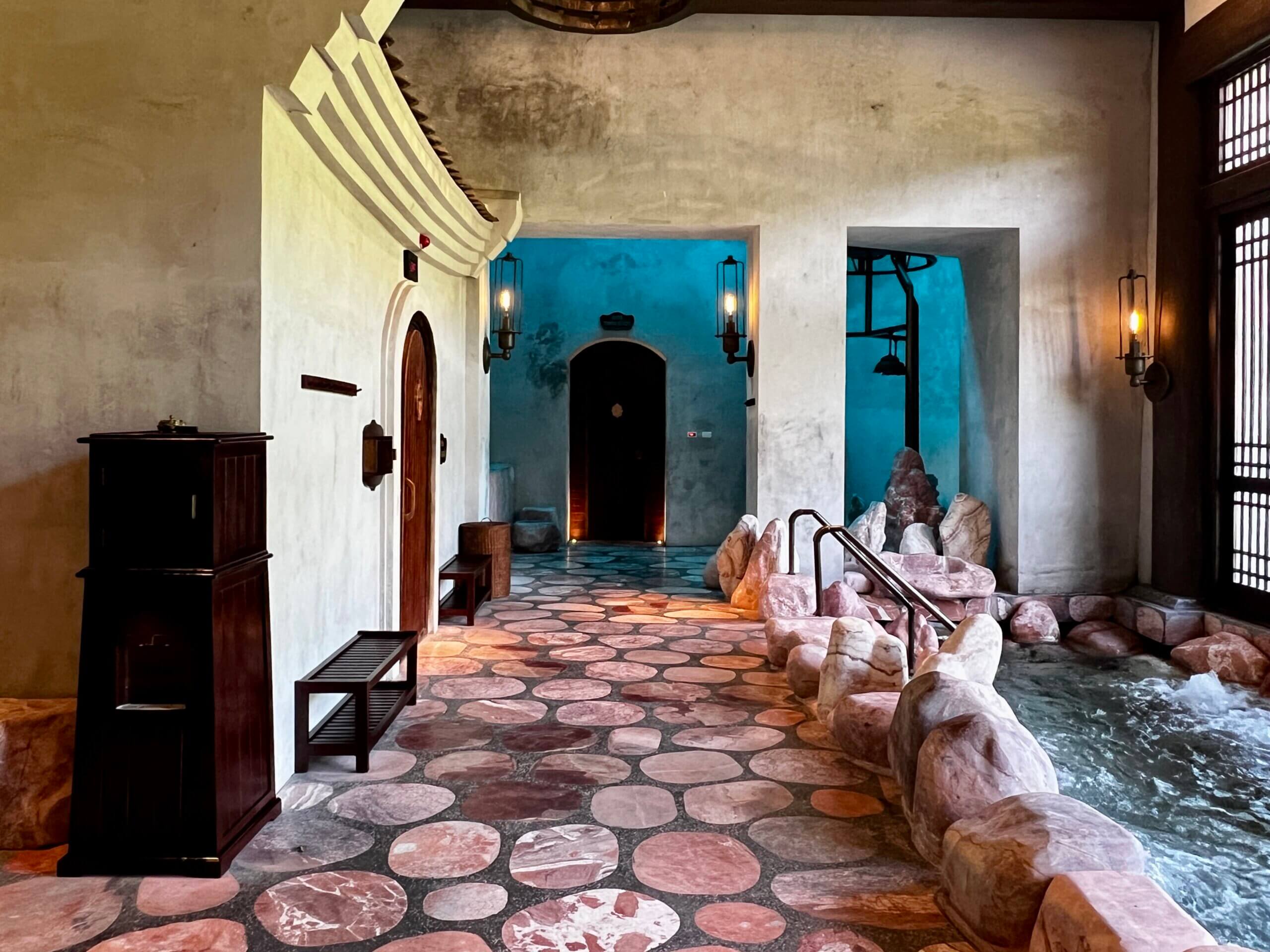 途中ホワイエに出て、スパ室までは中庭から光が差し込む廊下を歩いて向かいました。