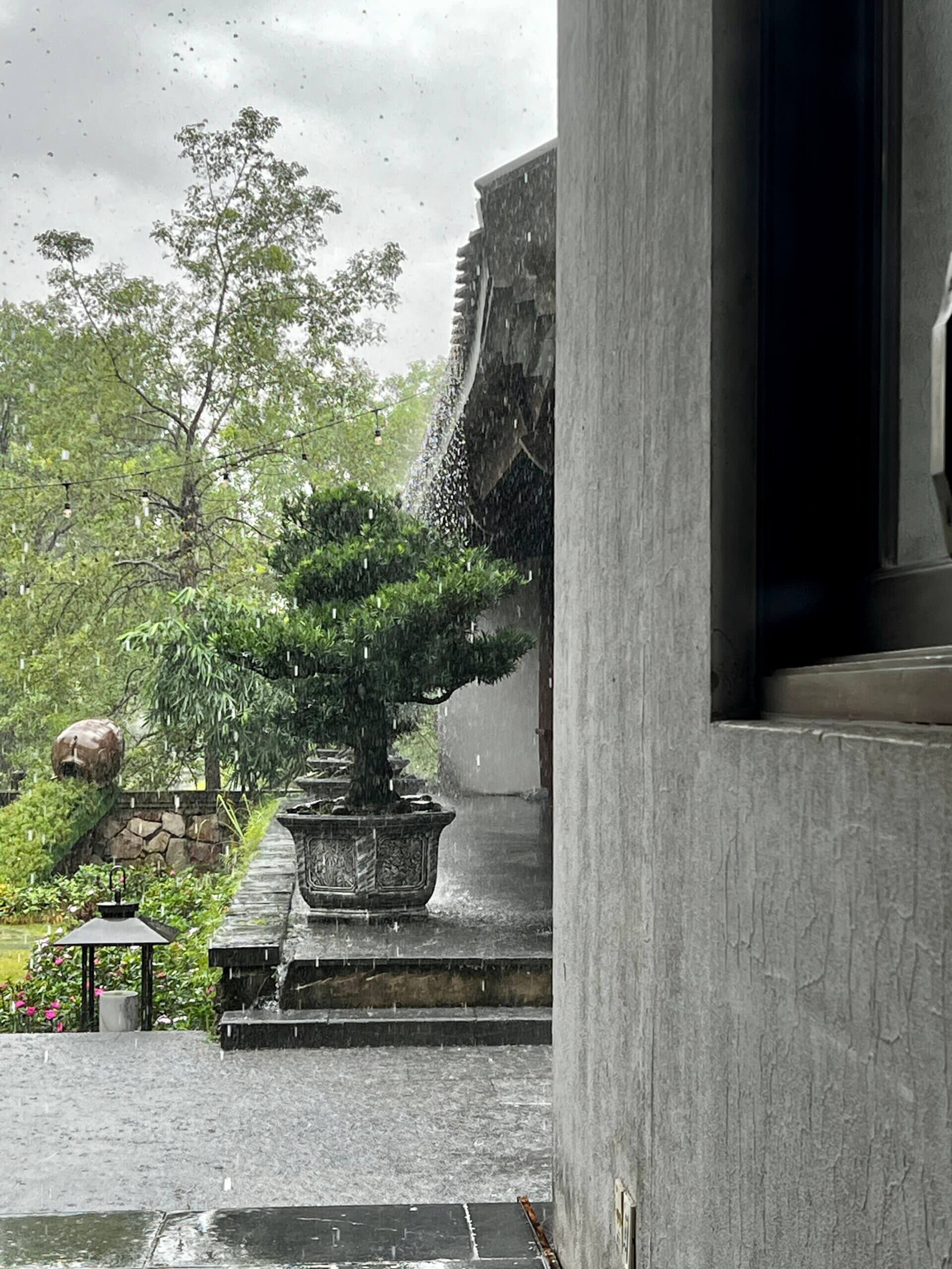 朝はビュッフェ形式で、メニューが非常に豊富でした。食べていると外は突然豪雨になりましたが、それも味わいがあって優雅な朝食の時間でした。