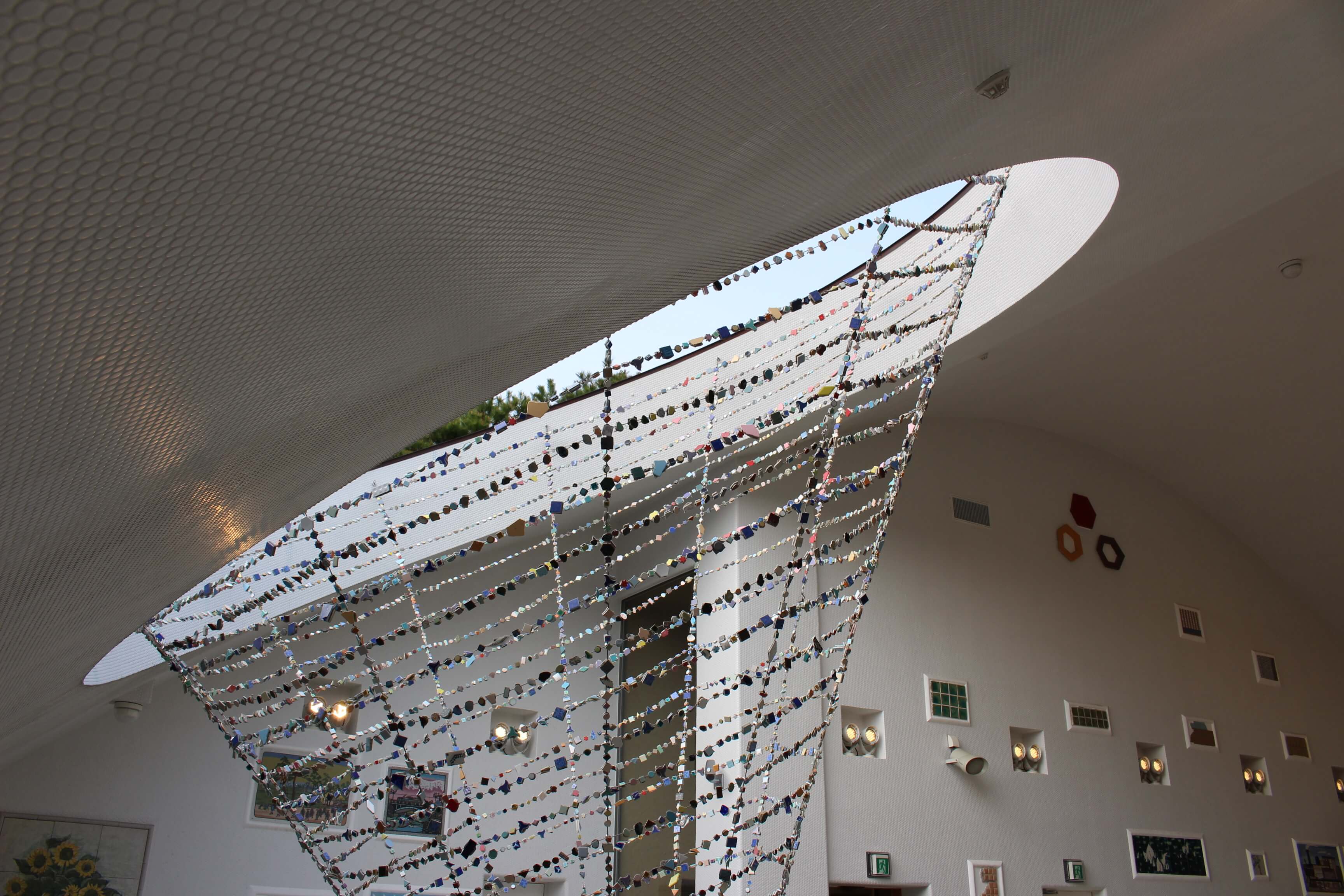 4階はタイルアートの展示があります。中でも面白かったのが、天井の抜けたところにあるタイルのカーテンです。