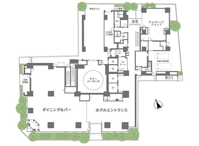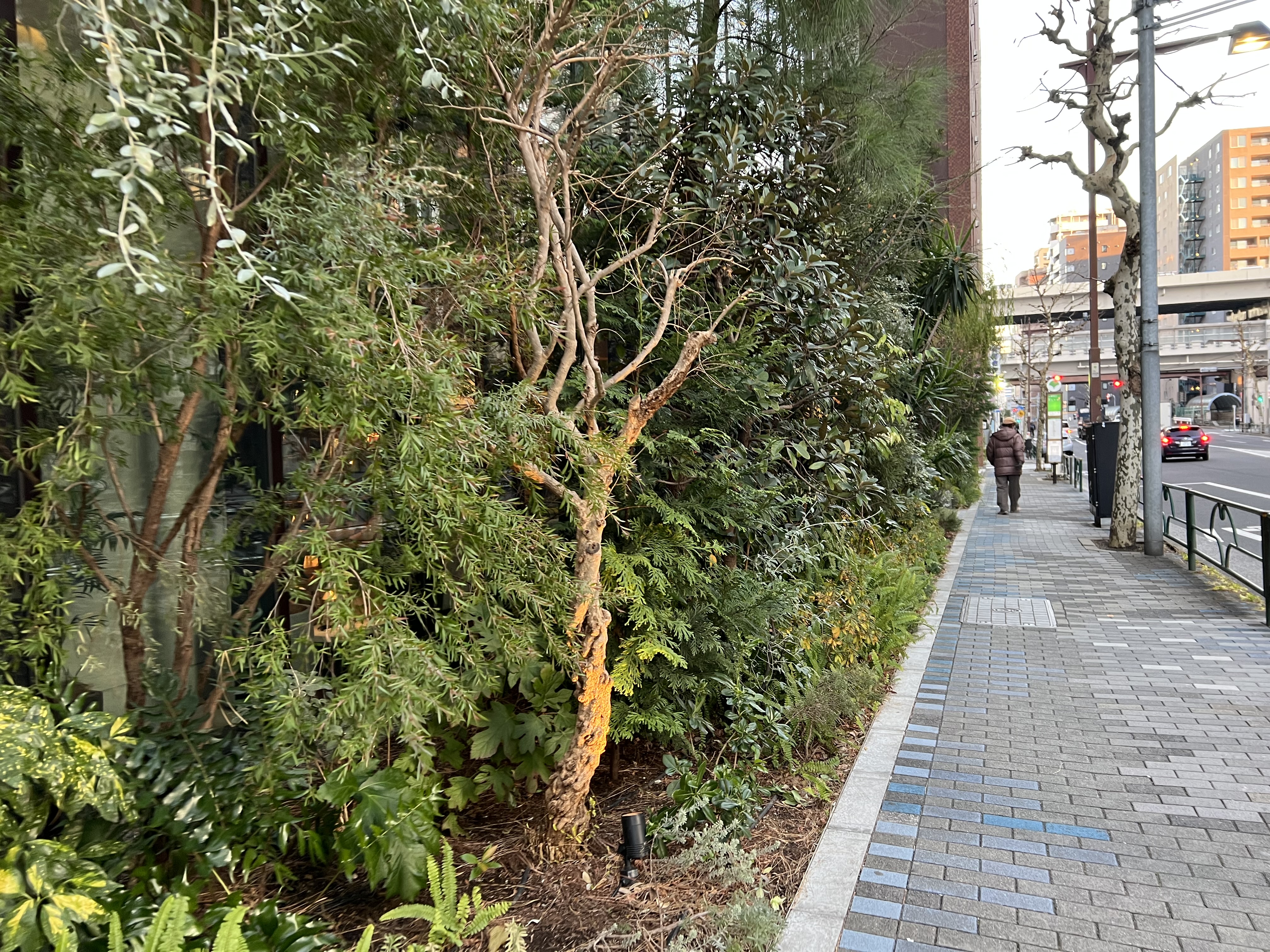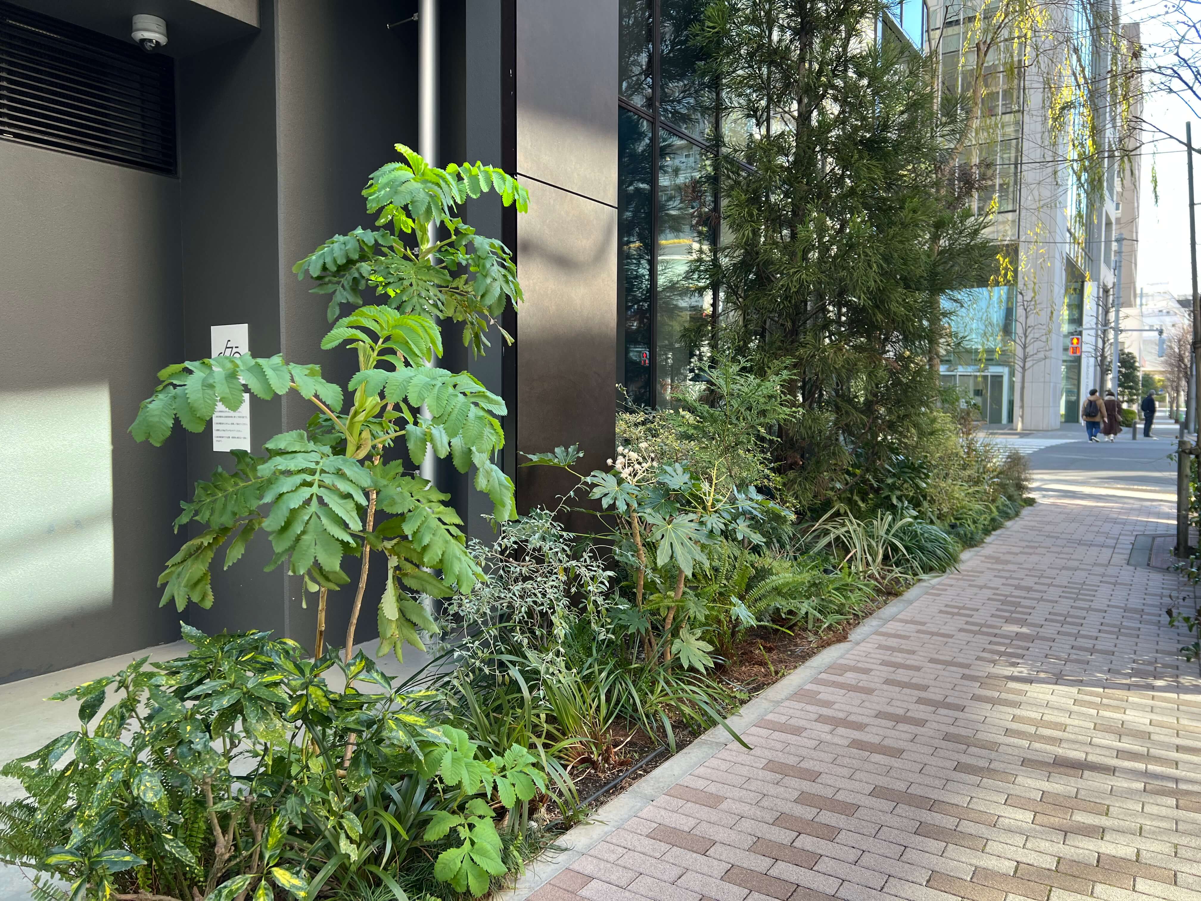 人目を引く通り沿いはバルコニーに植栽が植えられており、地上部にもふんだんに植えられているので建物全体が緑で植え尽くされているような印象を受けます。