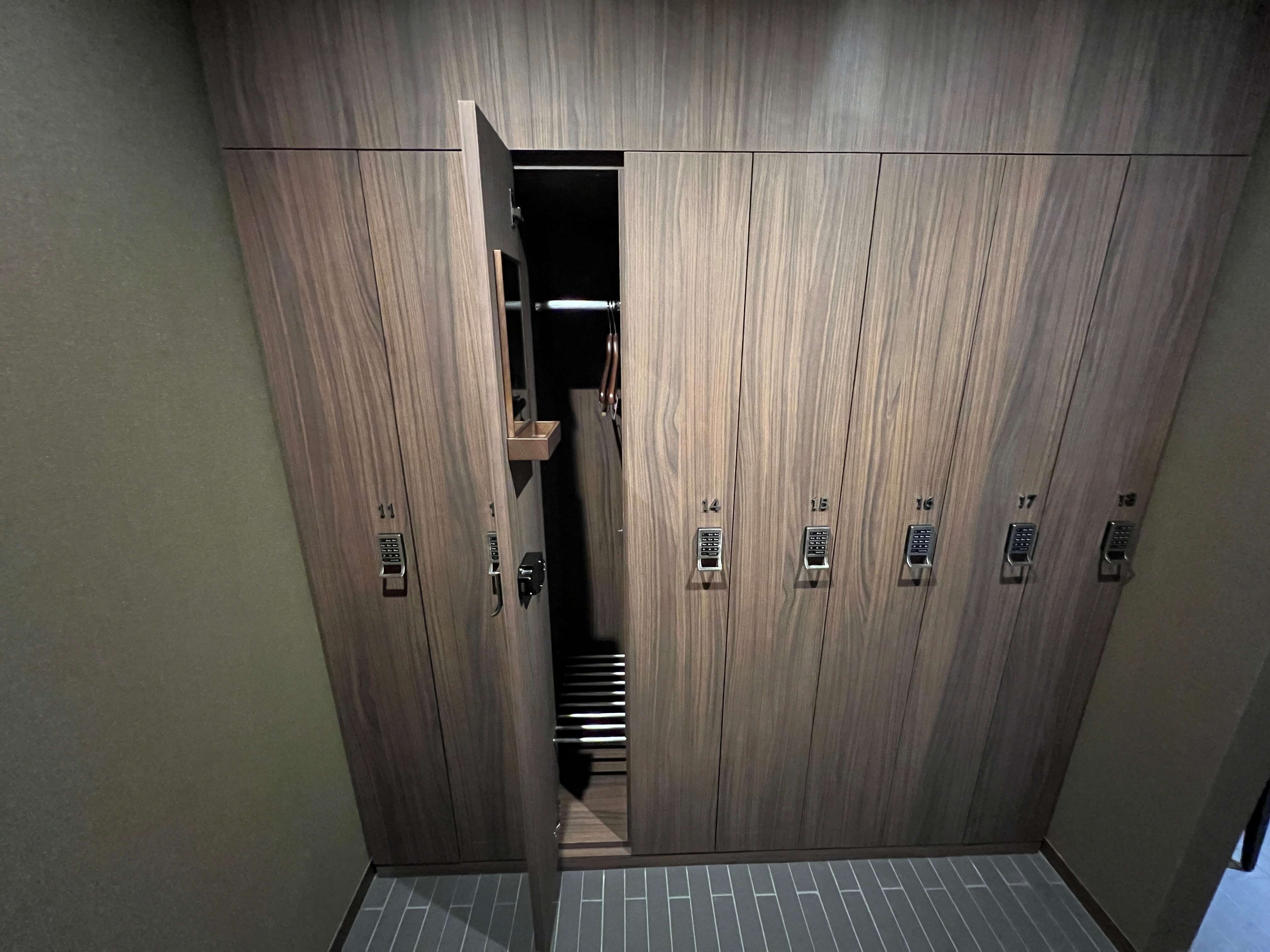 更衣室は綺麗で運動前の気持ちを高めてくれます。タオルやウォーターサーバーもあります。シャワーブースは広く、使い勝手の良い更衣室でした。