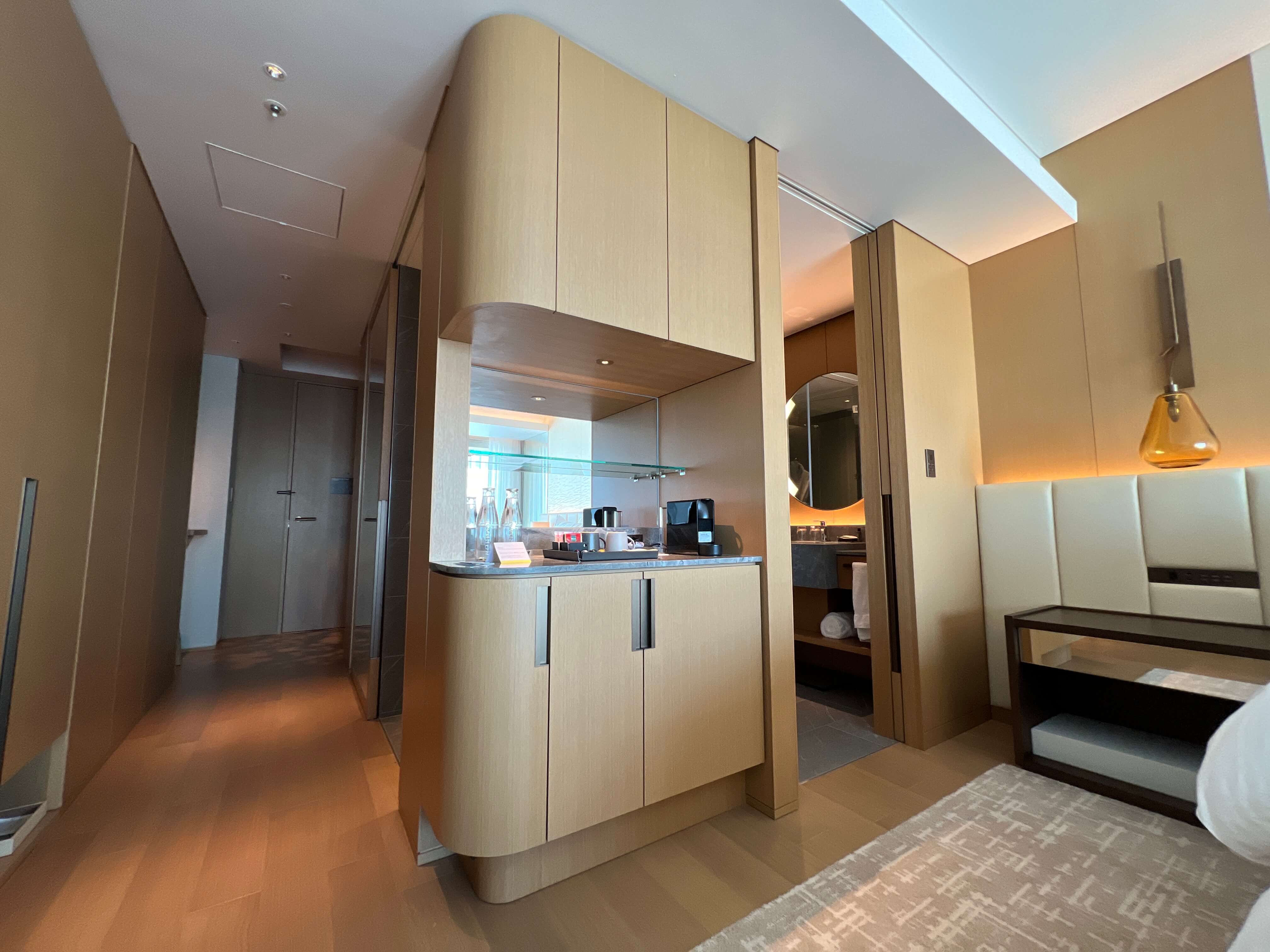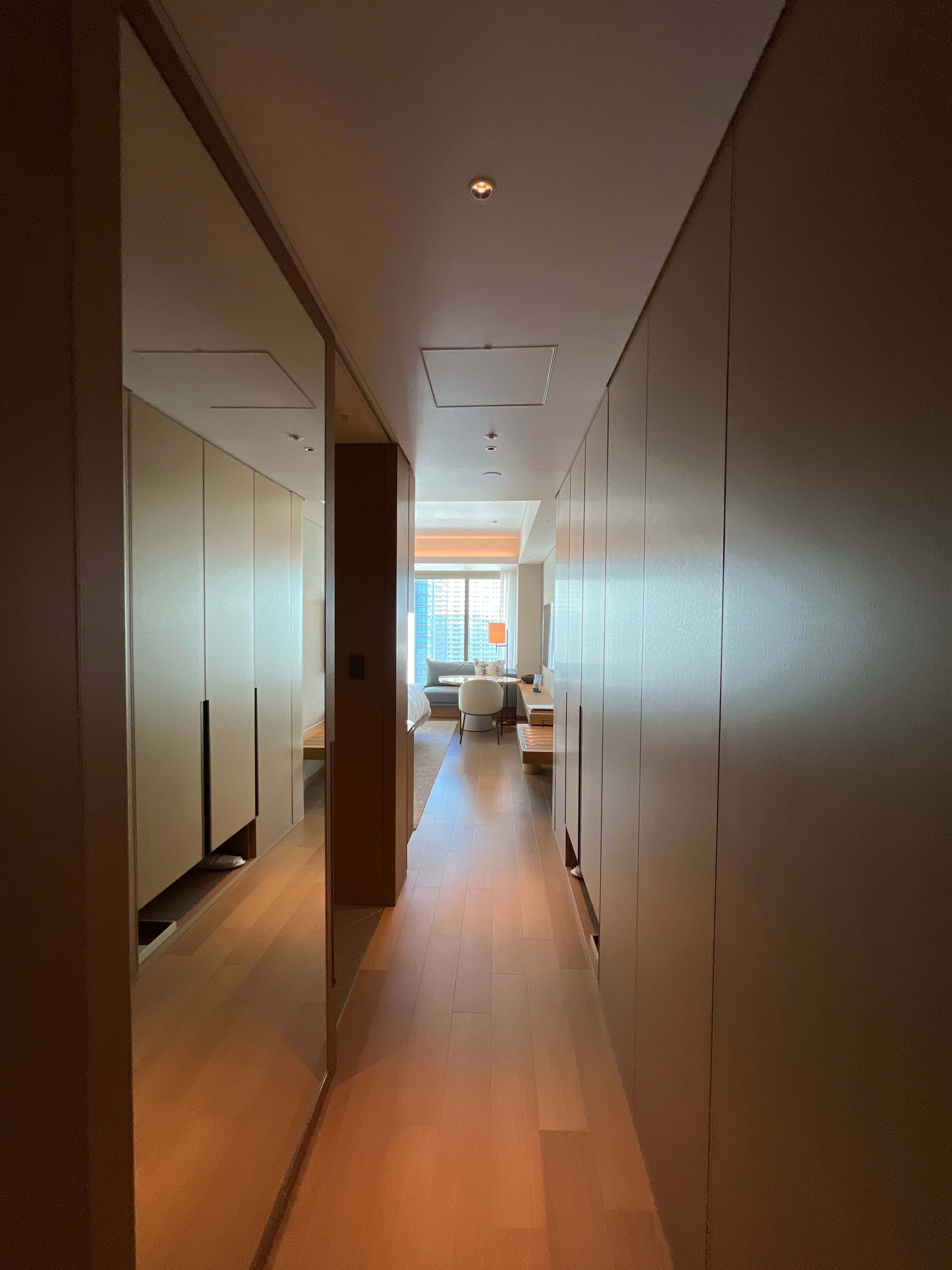 窓側の側面の壁には鏡が貼られていて、部屋を広く感じさせるようになっています。これは以前宿泊したオークラ東京でも見られた手法でした。