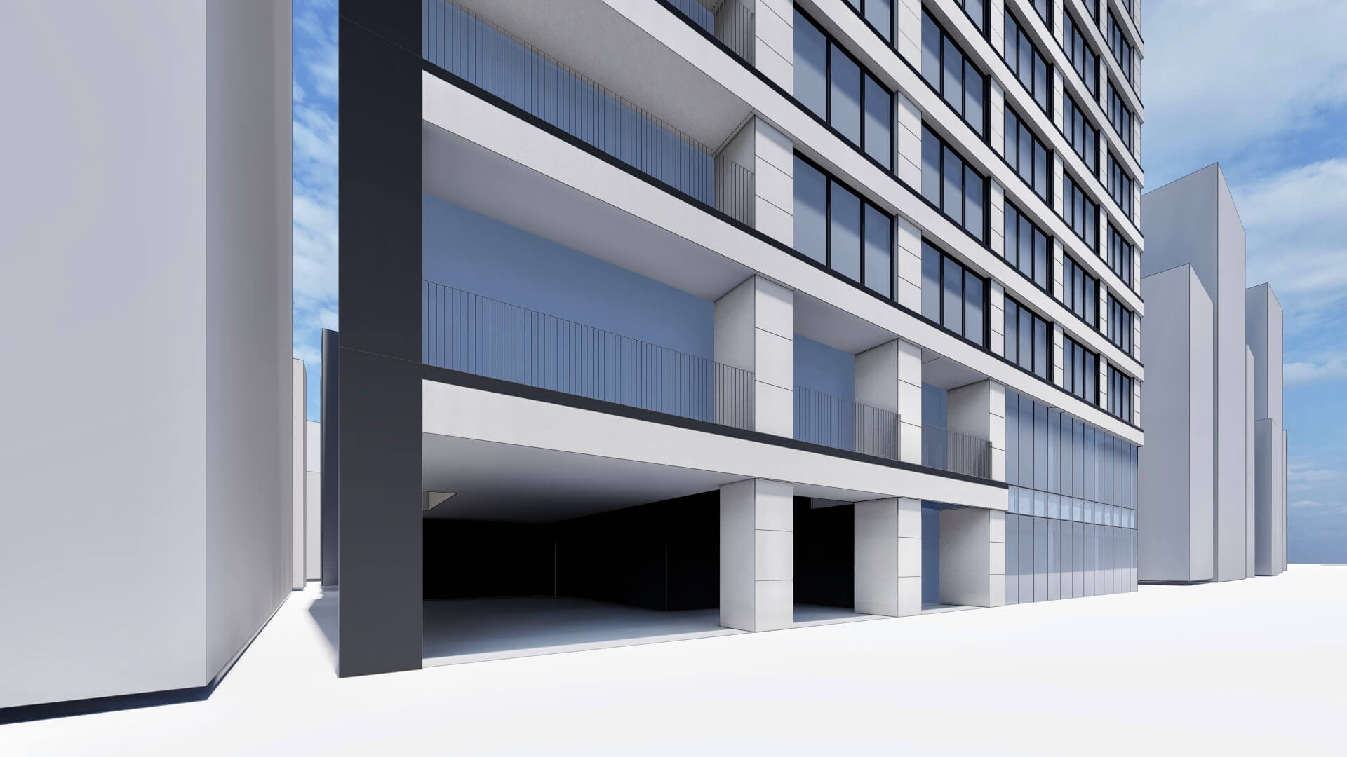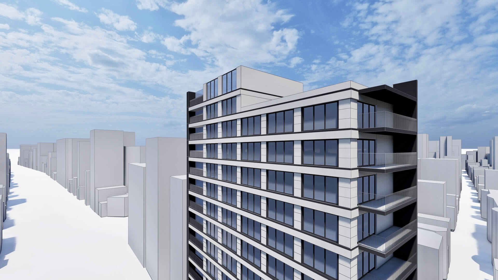 最終形のパースから逆算すると完成度は3割程度です。外観に表情をつけたくて、浜町ホテルのようにバルコニーを作りました。