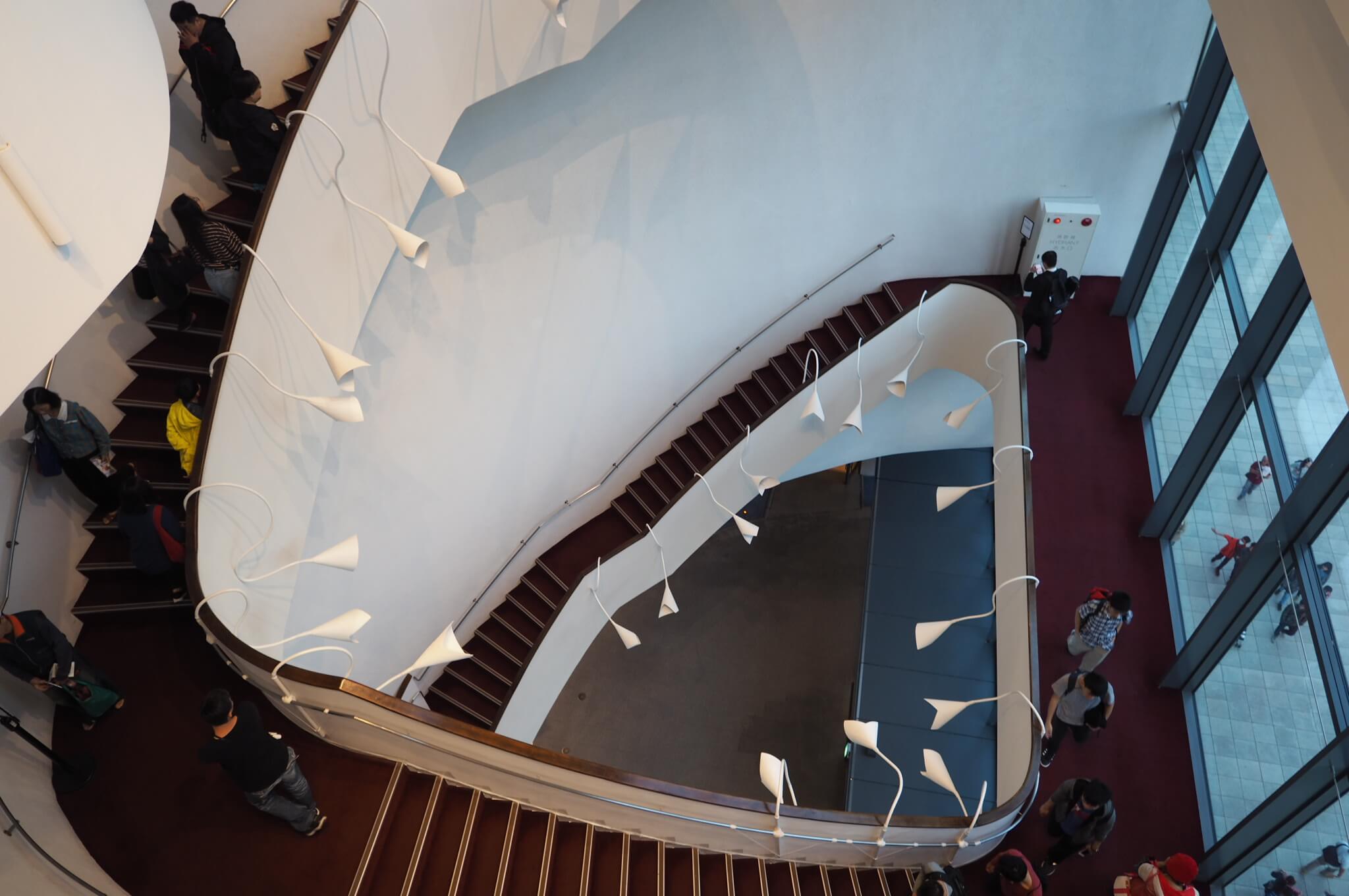 5階へと一気に上がる階段は壁に沿って付いているのですが、他の部分に見られる曲面が階段では角ばっていたのが少し残念でした。しかし吹き抜けと一体した階段は建物の上下方向と内外を密接に繋げるのに非常に寄与していました。