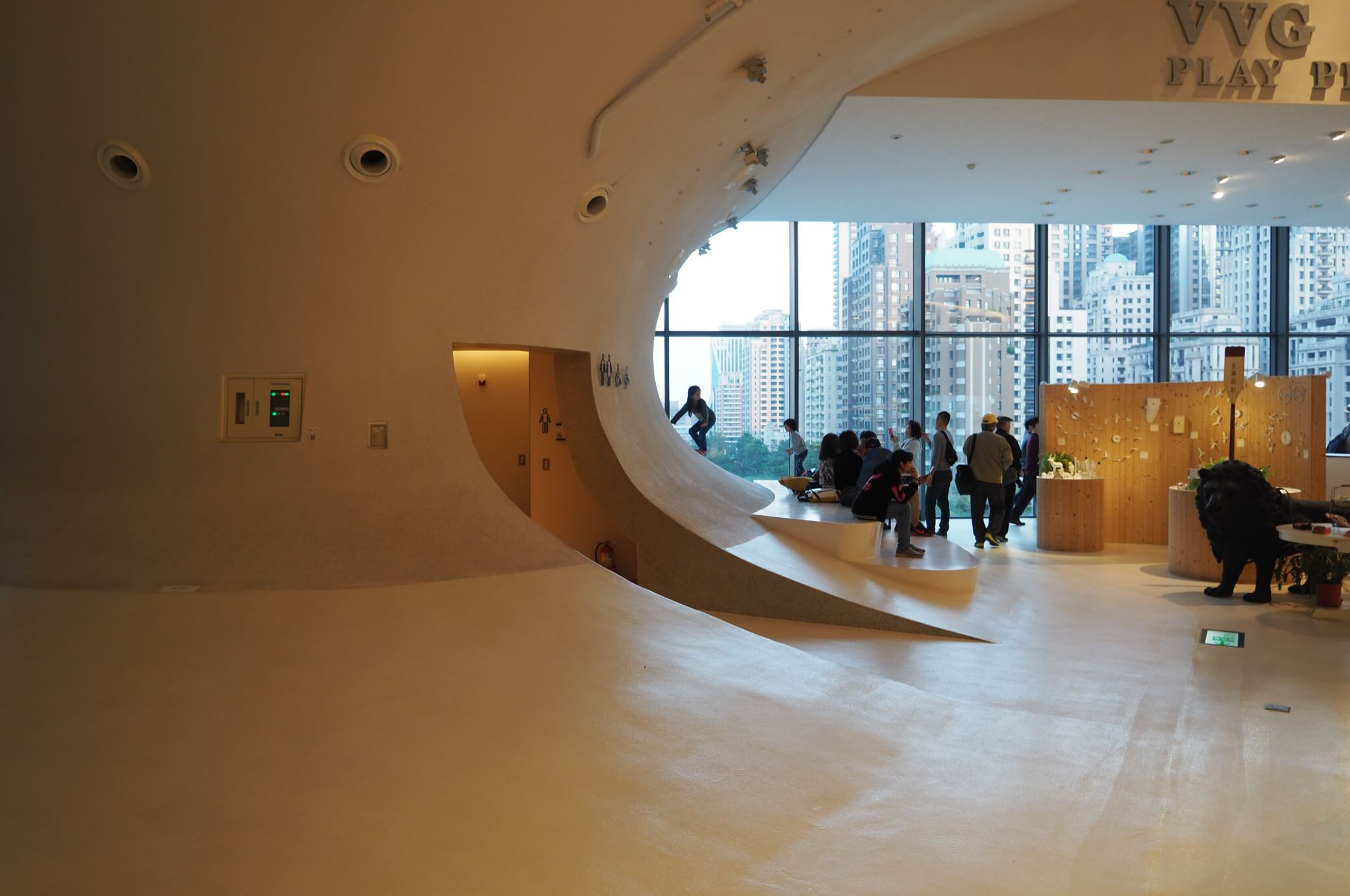 子供はこういう上がり下がりがあると遊びたくなるのだと思います。そこには「Don’t clime」と書いてありましたが、実際に走って登ろうとしていた子もいたくらい体が疼く床です。