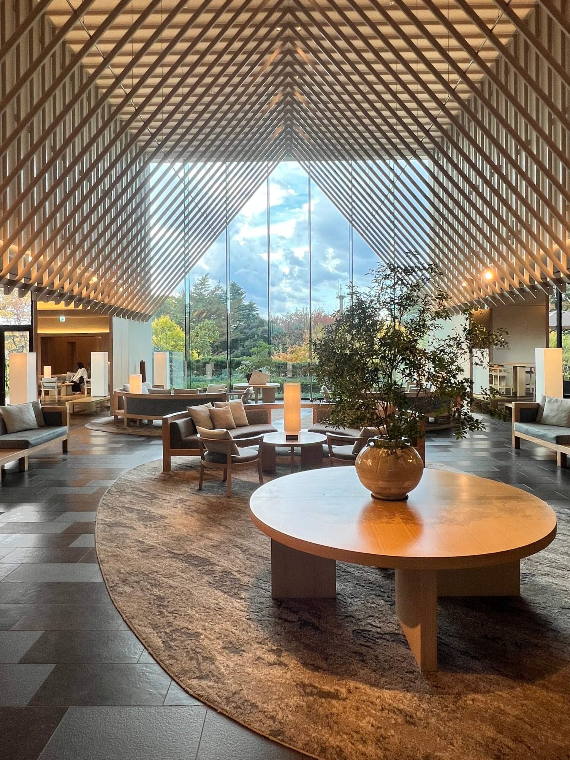 エントランスからロビーに続く空間には、切妻屋根の骨組みを思わせる天井装飾が施されています。