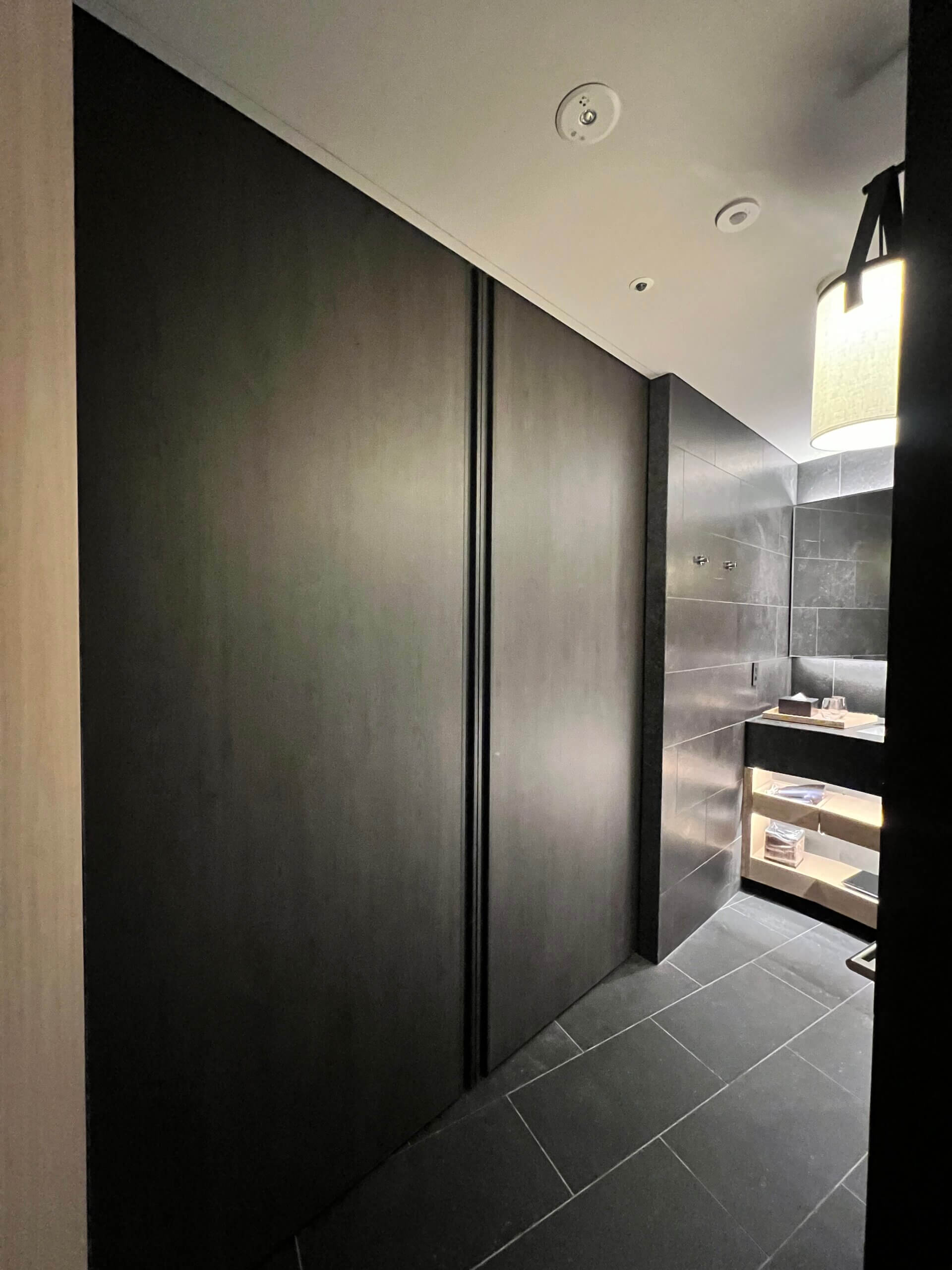 ベッドルーム側から水回り側の壁を見ると、一面が黒の壁となっていました。両引き戸も黒です。