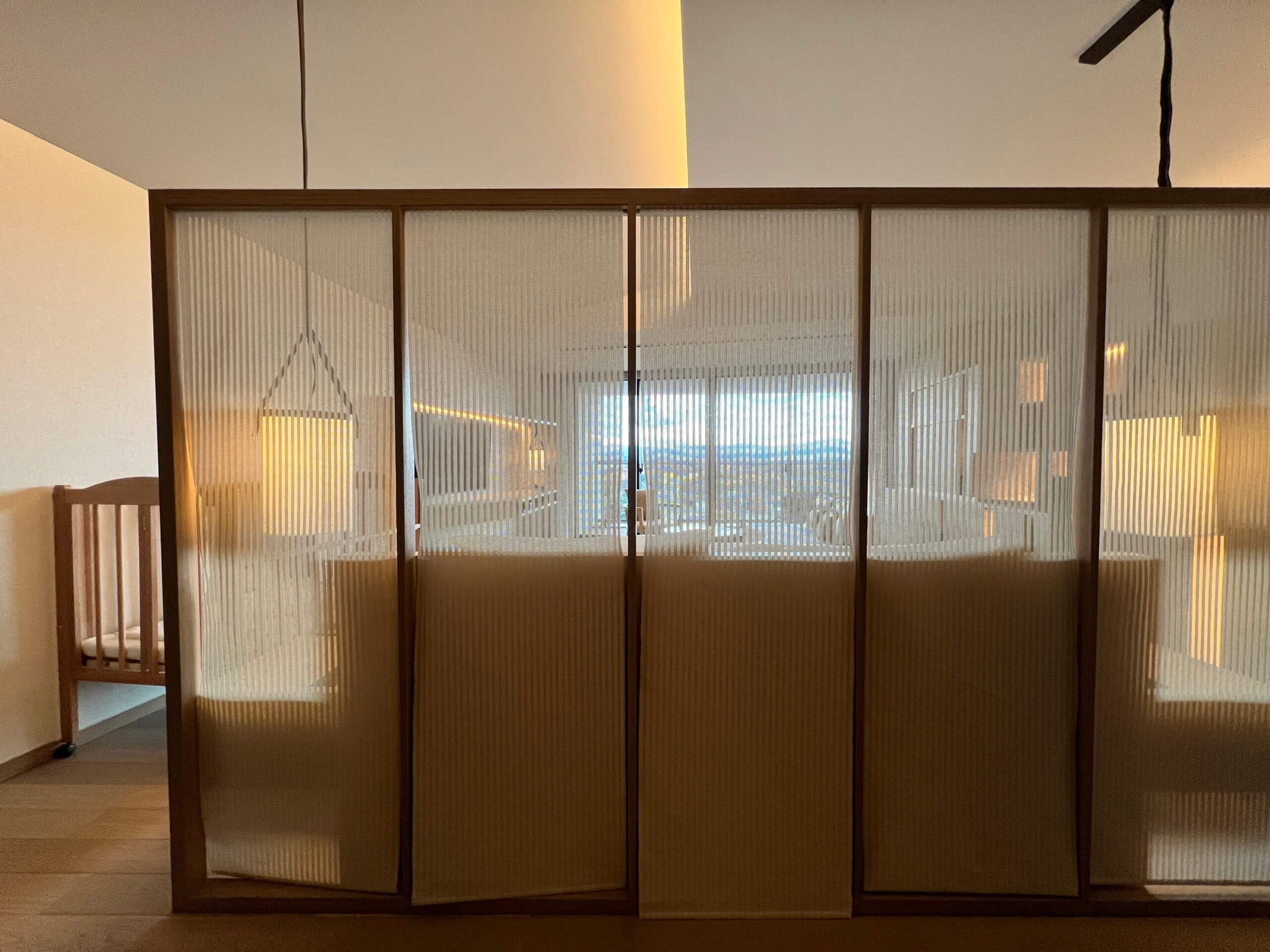 廊下の壁が屏風のように折れていましたが、それが客室にも現れており、直角でない壁が空間の広がりを簡単には把握できない面白さがありました。