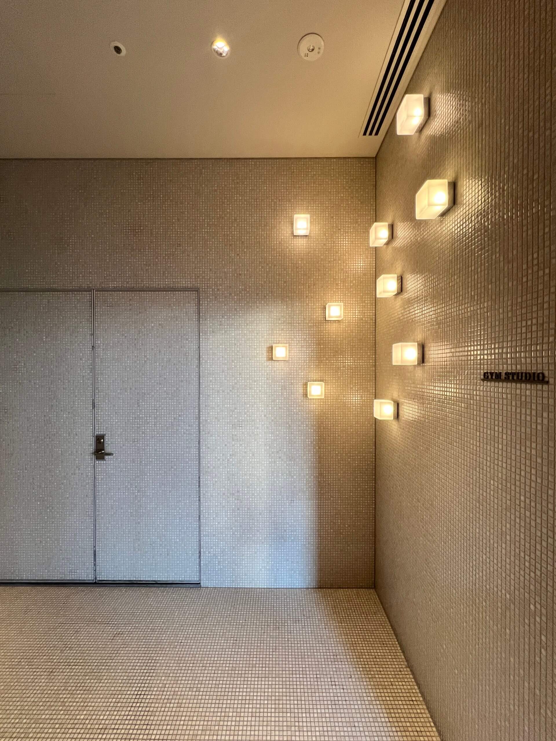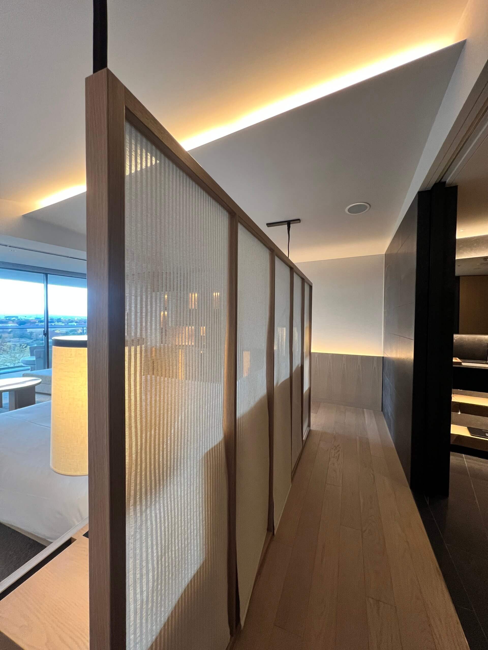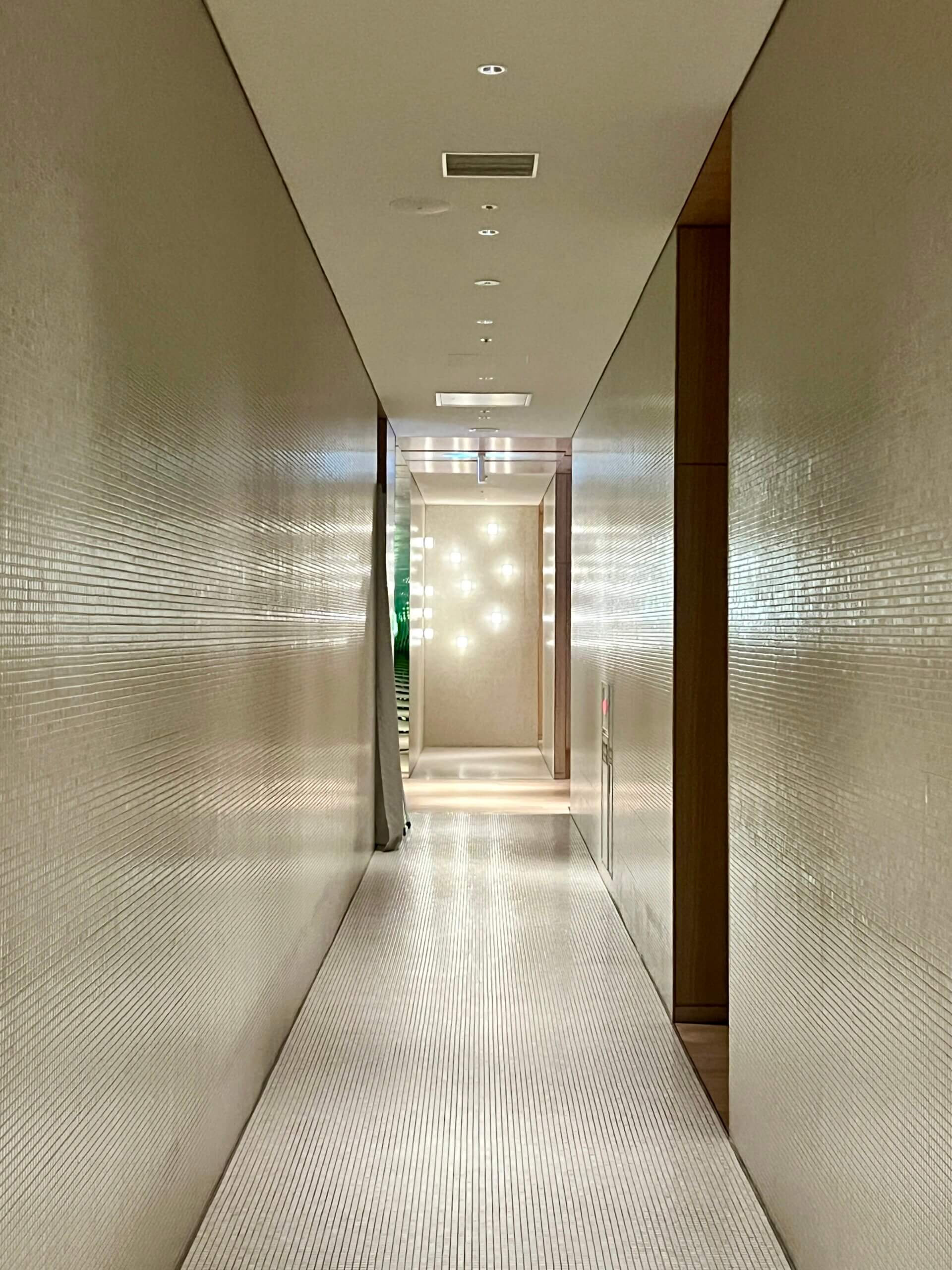 さらに小口部分にあるミラーが視覚的な広がりを生み出していました。興味深い廊下のデザインでした。