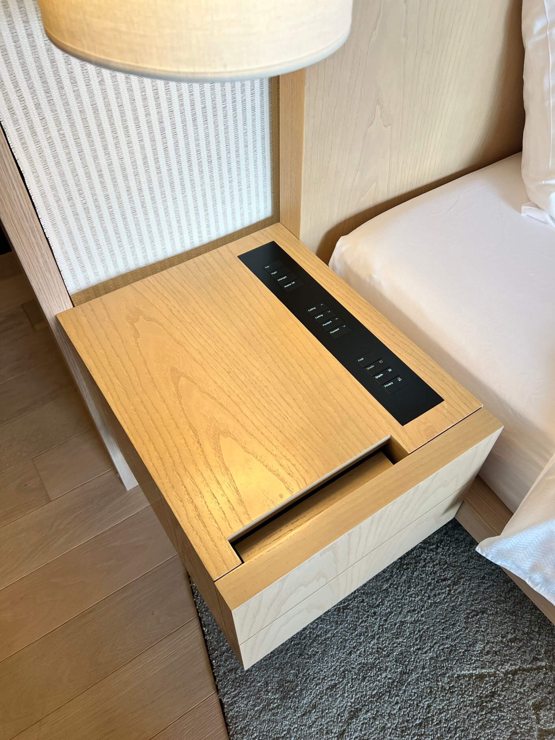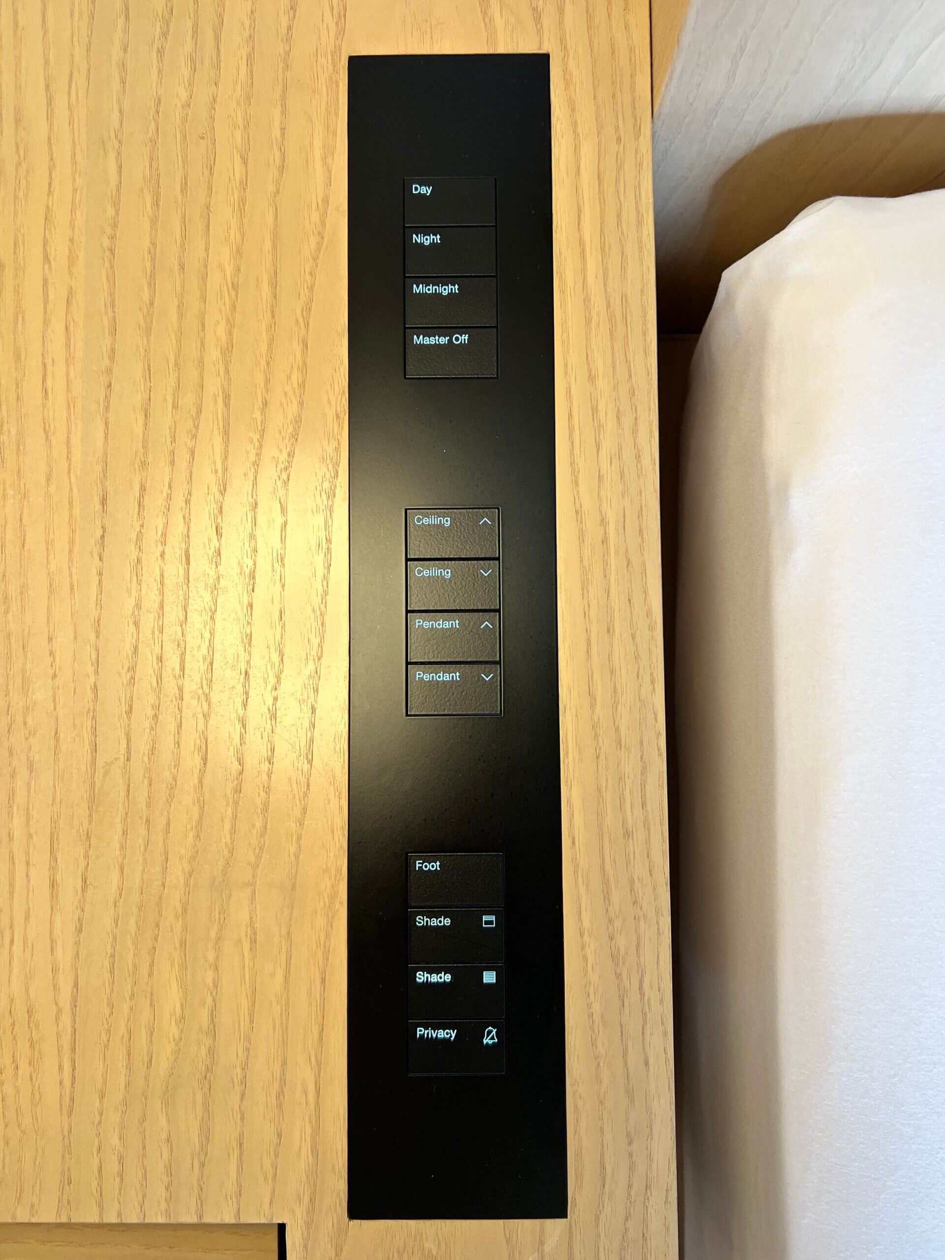 また、ナイトテーブルには照明やカーテンの制御スイッチが埋め込まれていました。